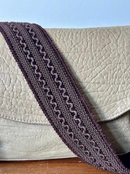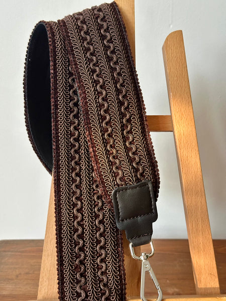 Asa para cruzar tu bolso confeccionada con tejido bordado goyesco y terminal de piel marrón oscuro.
