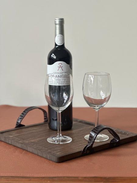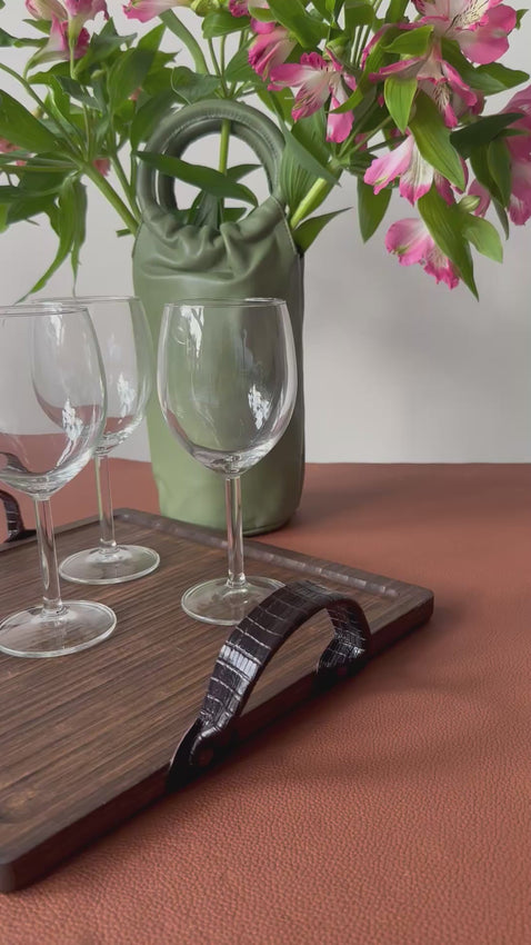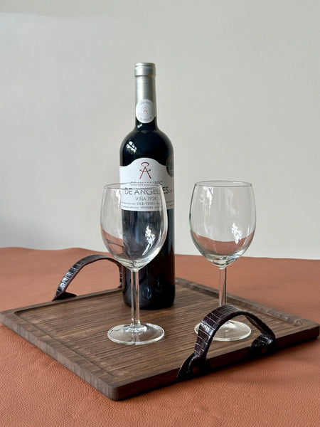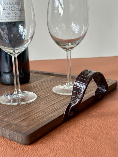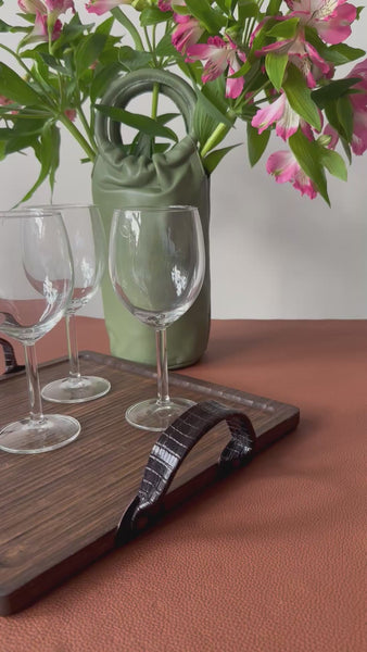 Bandeja de madera de bambú, ligera de peso y tratada y envejecida a mano en tono marrón oscuro. Las asas son de piel grabada en tono burdeos y están remachadas a la bandeja con apliques oro viejo.