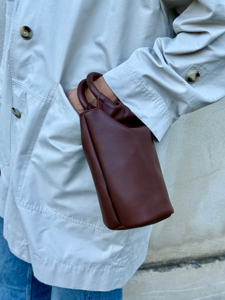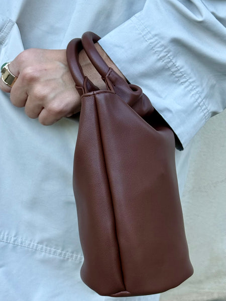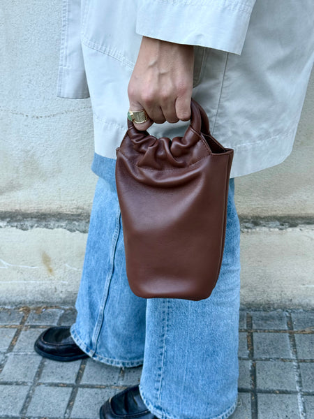 Bolsito de mano de piel lisa color marrón con asas forradas de la misma piel.