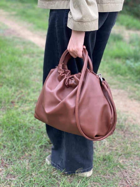 Bolso fruncido de piel lisa y muy suave en tono marrón avellana con dos asas redondas forradas de la misma piel. Puede llevarse tanto de mano como colgado, ya que incluye su asa de la misma piel con mosquetones.