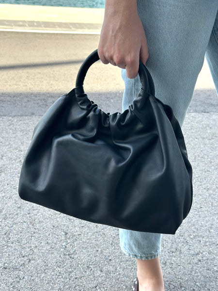 Bolso fruncido de piel lisa negra y muy suave con dos asas redondas forradas de la misma piel. Puede llevarse tanto de mano como colgado, ya que incluye su asa de la misma piel con mosquetones.