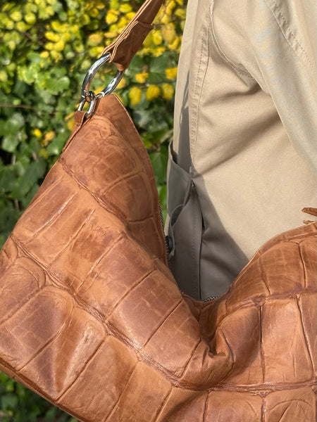 Bolso de tamaño medio ideal para llevarlo al hombro, con cierre de cremallera. La piel es grabada en tono cuero y no pesa. El asa es de piel por ambas caras y se ajusta al bolso con dos argollas plateadas tipo mosquetón que permiten cambiarla fácilmente si se necesita.