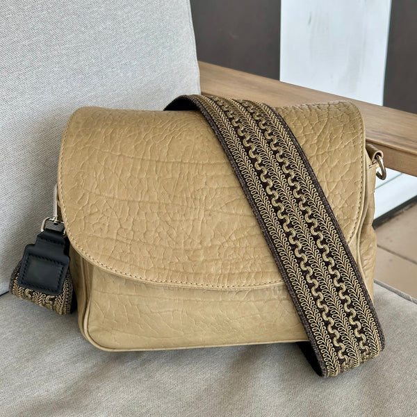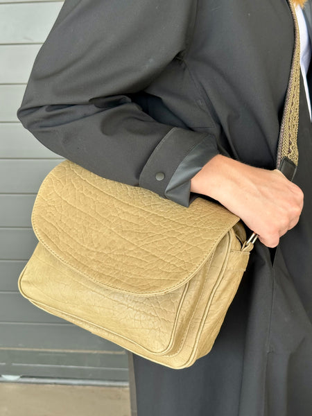 Bolso tipo cartuchero grande con solapa que se cierra mediante cremallera. La piel es grabada de color arena. En su exterior lleva un bolsillo abierto.