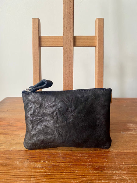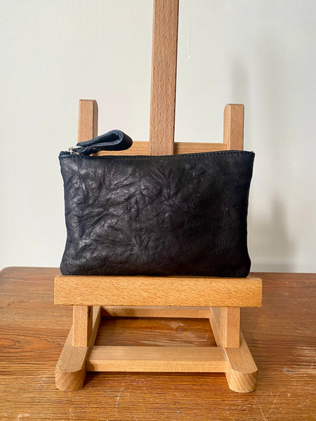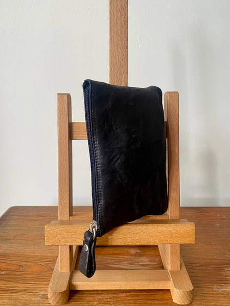 Monedero ideal para llevar tarjetas, billetes o monedas. Confeccionado en piel grabada color negro. Está forrado en su interior con tejido de algodón negro. Se cierra mediante cremallera. El tirador de la cremallera es de piel negra.