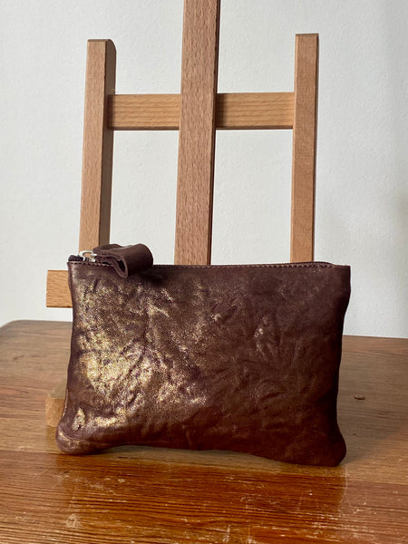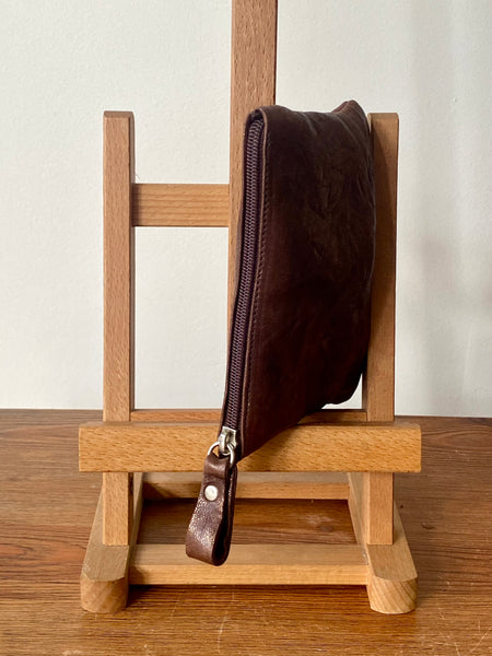 Monedero ideal para llevar tarjetas, billetes o monedas. Confeccionado en piel marrón púrpura. Está forrado en su interior con loneta de algodón negro. Se cierra mediante cremallera. El tirador de la cremallera es de la misma piel.
