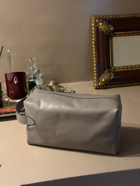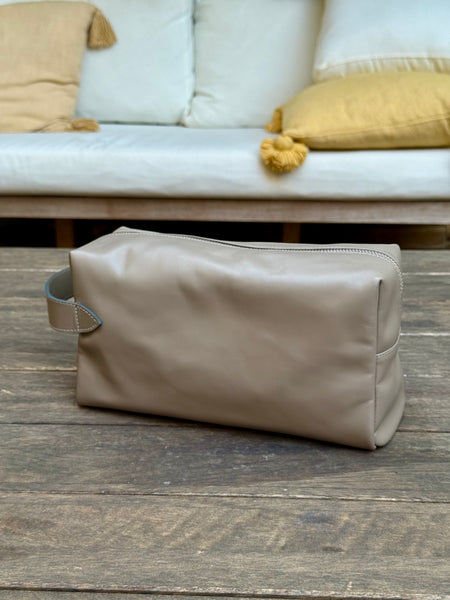 Neceser con cierre cremallera y asa lateral. Todo es de la misma piel de color visón.
