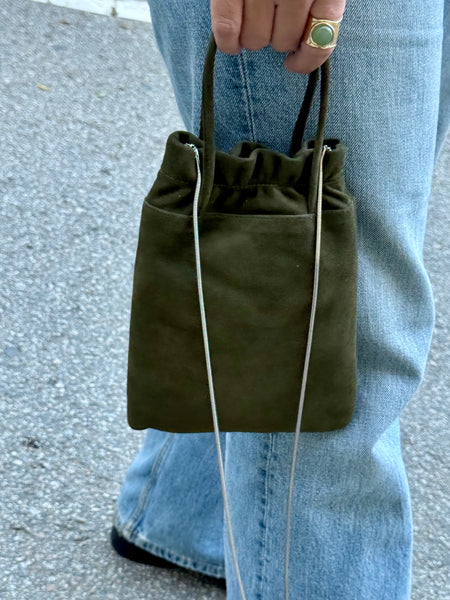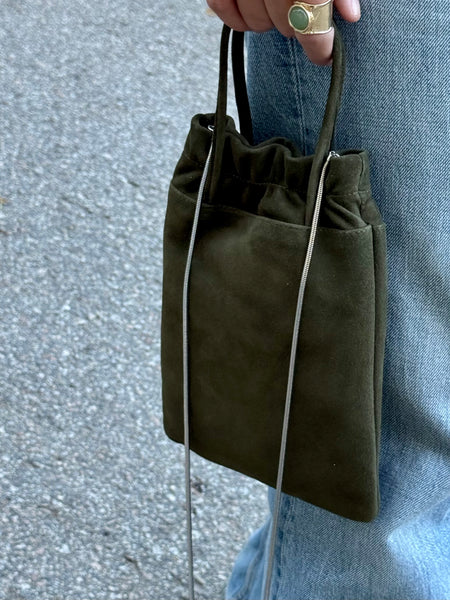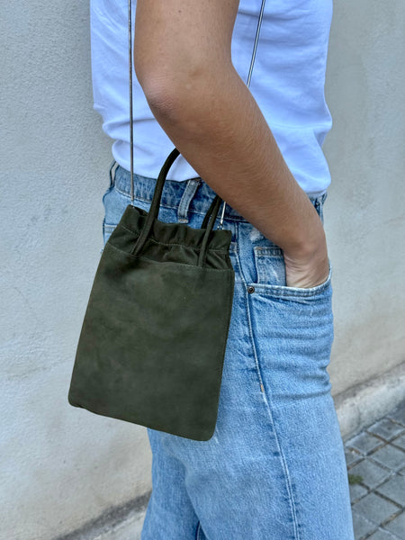Bolsito de piel de ante color verde caqui con su asa de la misma piel ideal para llevar pequeñas cosas: móvil, gafas y llaves. Muy ligero y cómodo. El forro interior es de loneta de algodón negro y se cierra mediante un broche de imán.