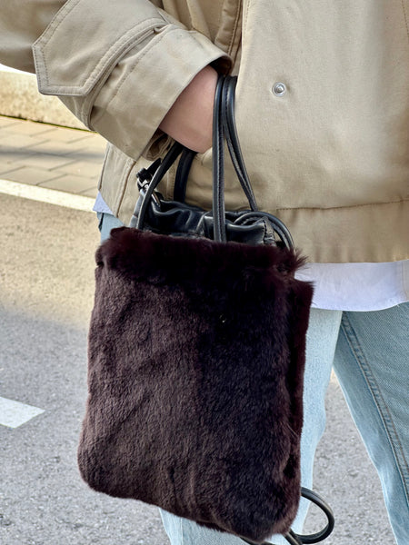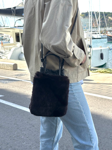 Bolsito de piel de conejo de color marrón con el vivo y su asa en piel lisa marrón. Ideal para llevar pequeñas cosas: móvil, gafas y llaves. Muy ligero y cómodo. El forro interior es de loneta de algodón negro y se cierra mediante un broche de imán.