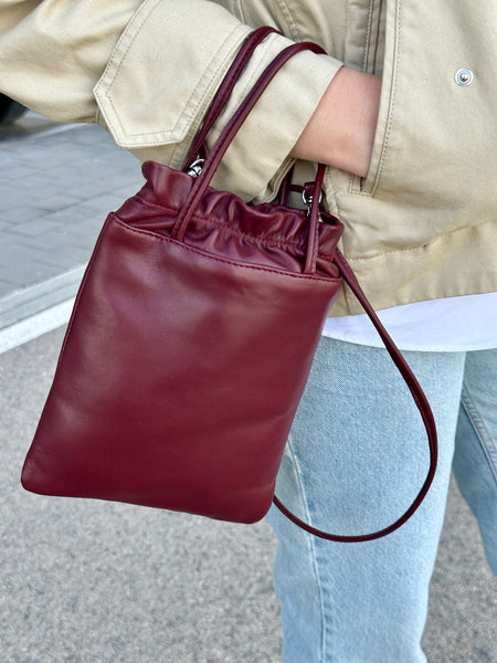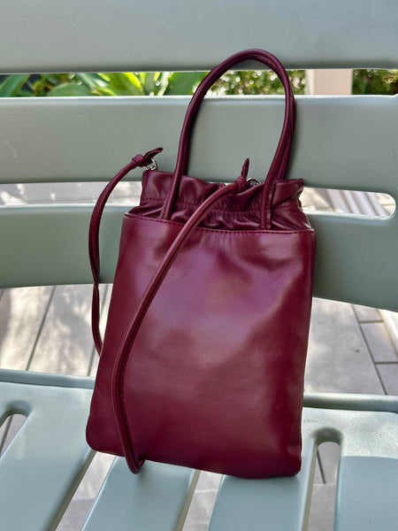 Bolsito de piel lisa de color burdeos con su asa de la misma piel ideal para llevar pequeñas cosas: móvil, gafas y llaves. Muy ligero y cómodo. El forro interior es de loneta de algodón negro y se cierra mediante un broche de imán.