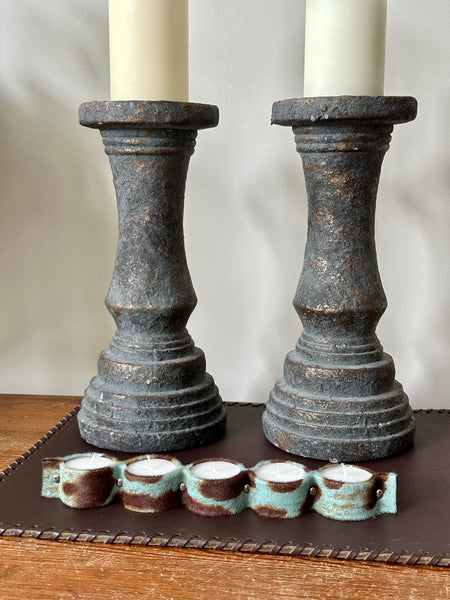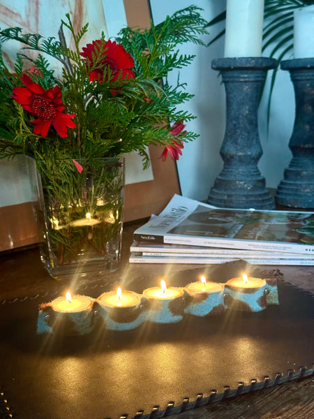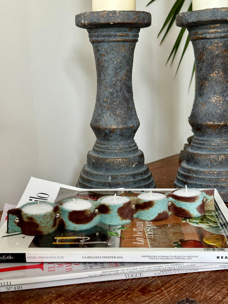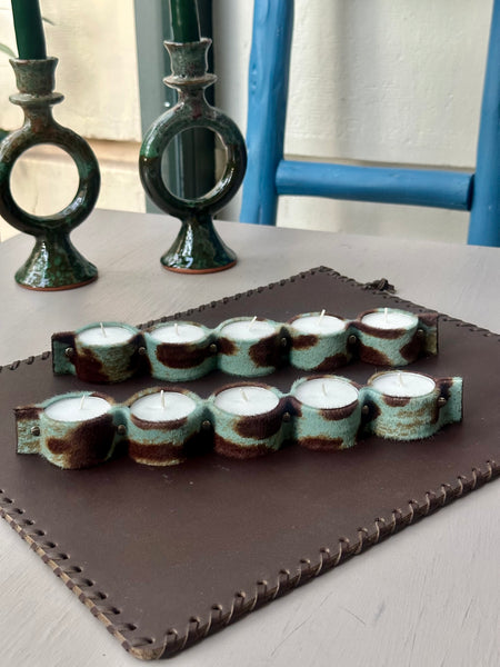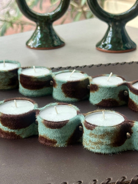 Porta velas confeccionado en piel de potro print azul para colocar 5 velas tipo té, de tamaño XXL. Al ser velas dobles su duración encendidas es de 6/8 horas aproximadamente.