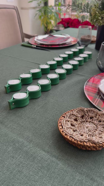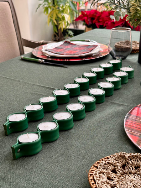 Portavelas confeccionado en piel lisa verde césped para colocar 10 velas tipo té, de tamaño XL, cuya duración encendidas es de 6/8 horas.