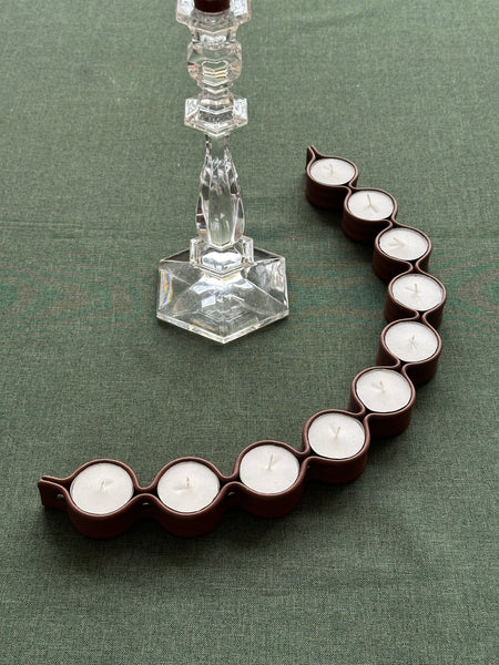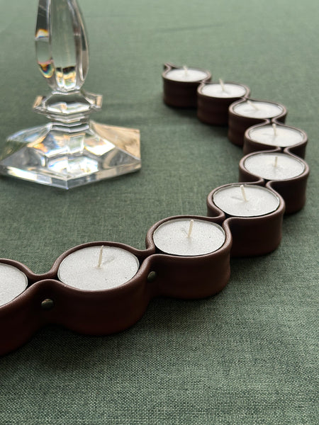 Portavelas confeccionado en piel marrón avellana para colocar 10 velas tipo té, de tamaño XL, cuya duración encendidas es de 6/ 8 horas.