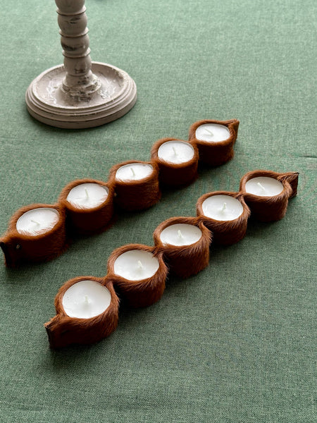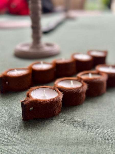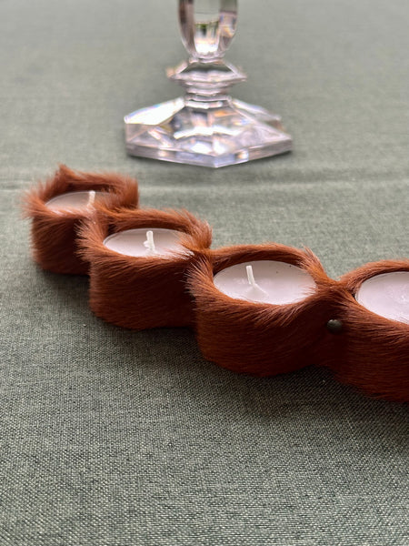 Portavelas confeccionado en piel de potro color avellana para colocar 5 velas tipo té, de tamaño XL, cuya duración encendidas es de 6/ 8 horas.